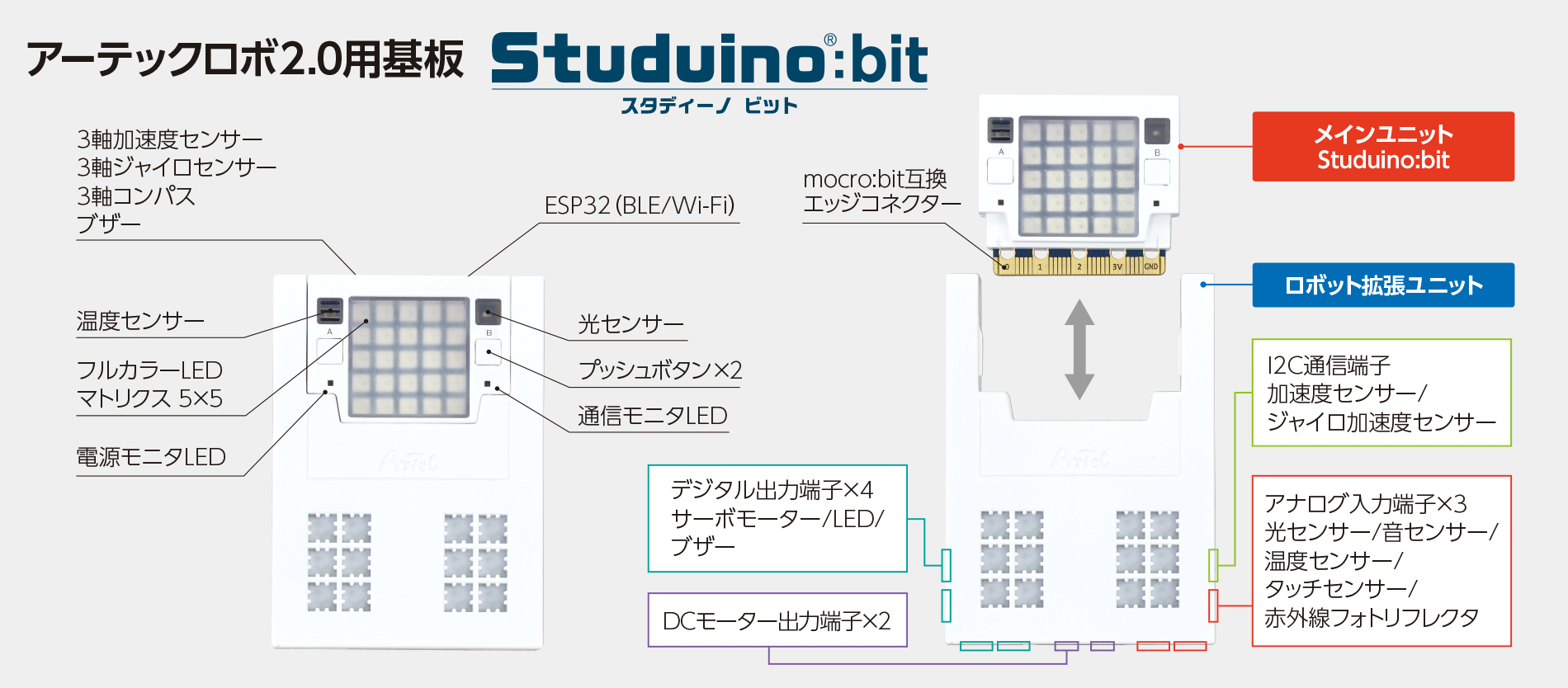 7つのセンサー、25個のフルカラーLED、ブザーを内蔵 Bluetooth・Wi-Fi搭載基板
