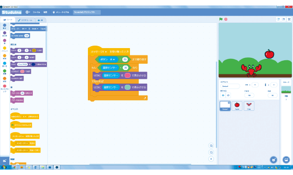 ロボットを制御するプログラムをつくるだけでなく、画面上のアニメーションや音声と連携したロボットの制御や、センサーの値に応じて画面上のキャラクターを動かすといった、デジタルコンテンツとハードウェアの連携した作品の製作が可能です。