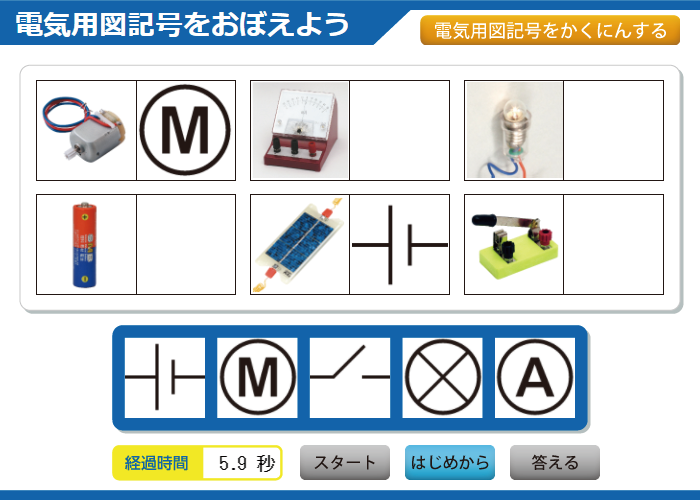 ドラッグ&ドロップ操作で正しい電気用図記号を答えるタイムトライアルクイズに挑戦します。