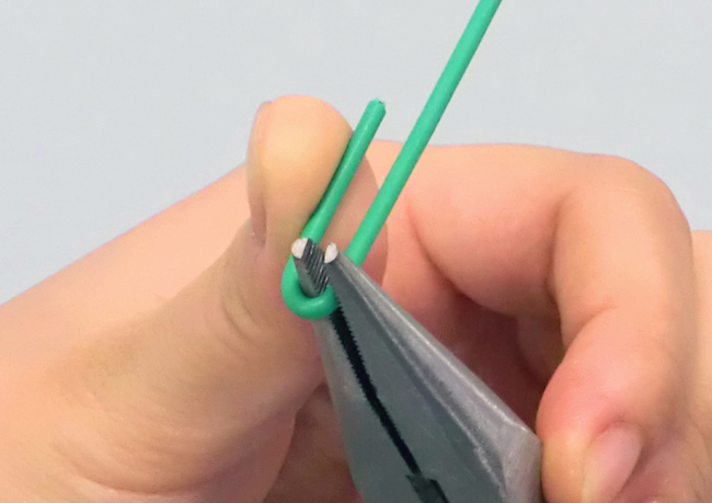 ②ラジオペンチの側面にそうように親指のはらでU字になるまで曲げます。