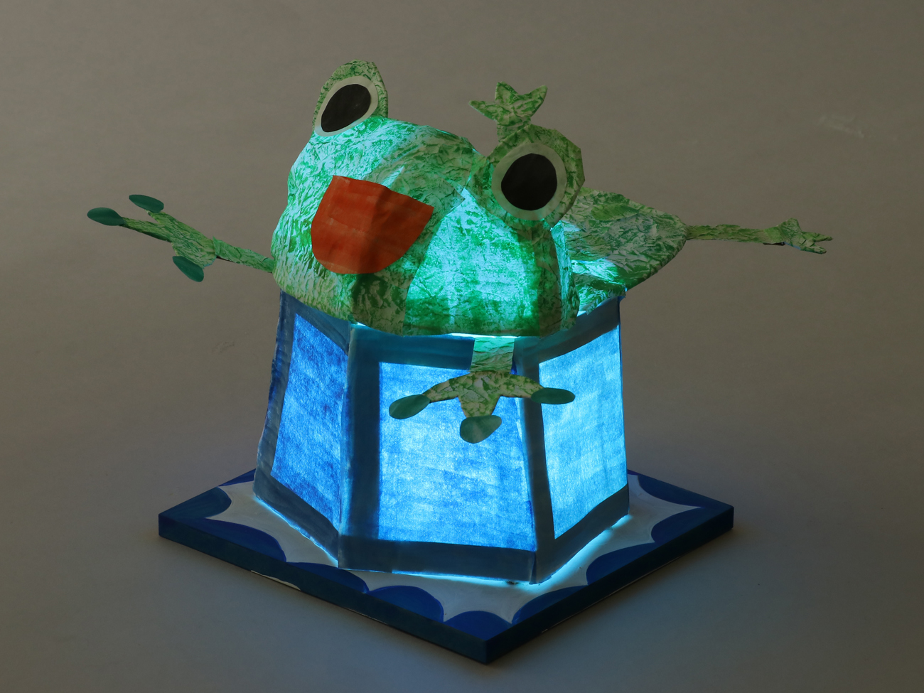 しわをつけた和紙に着色して、カエルをつくりました。土台を水色にすることで、カエルがジャンプしているような雰囲気に仕上げました。