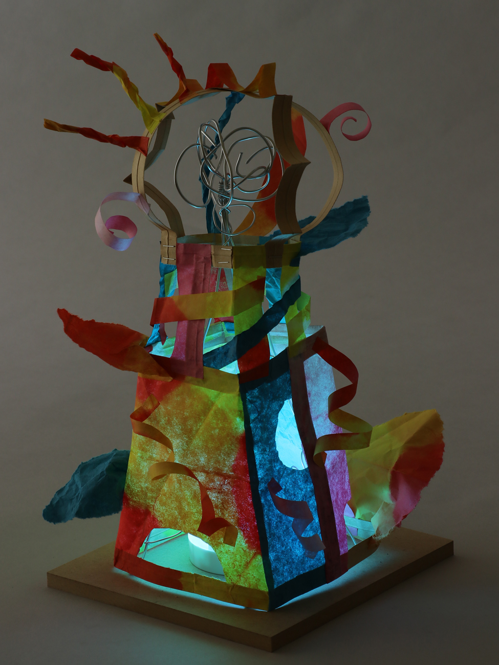和紙を色染めし、模様をつけました。ワイヤーと針金を使うと高さのある作品をつくることができます。