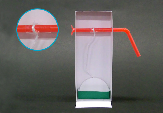 たこ糸を引っ張ると、エレベーターが昇ります。ストローにたこ糸を引っかけると、エレベーターが止まります。