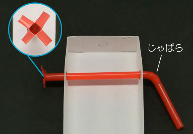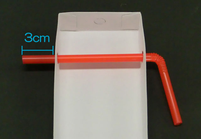 ②穴にストローを通し、じゃばらのない側が箱から3cmほど出るようにストローを切ります。
