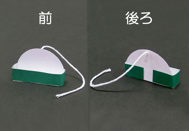 ②「⑥かまぼこ型のシート」と色がみでかごをつくり、後ろにセロハンテープでたこ糸を貼りつけます。