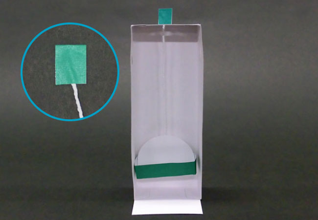 ③箱Bの穴にたこ糸を通し、たこ糸の先に穴よりも大きい色がみを貼ります。