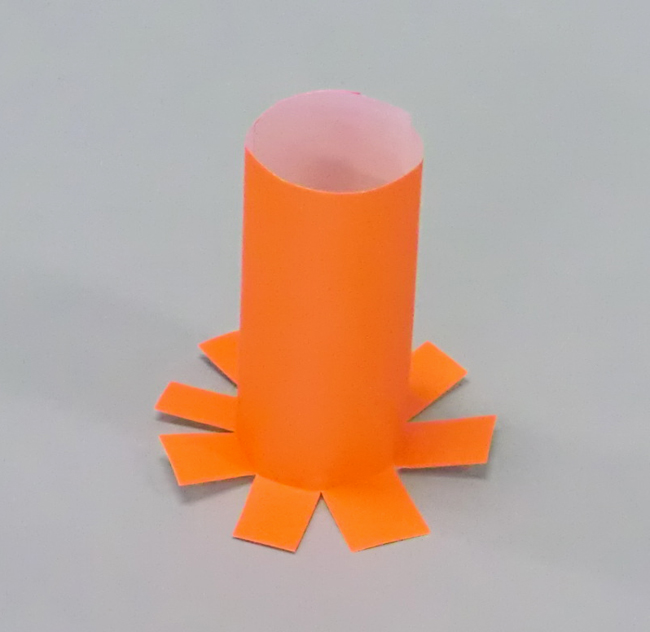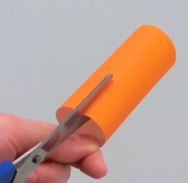①色がみを丸めて貼り合わせ、はさみで一周切り込みを入れます。
