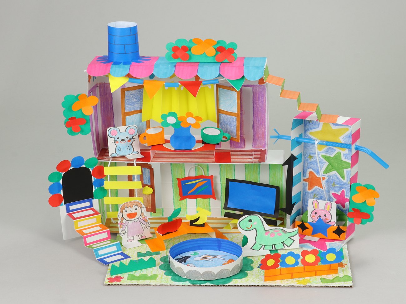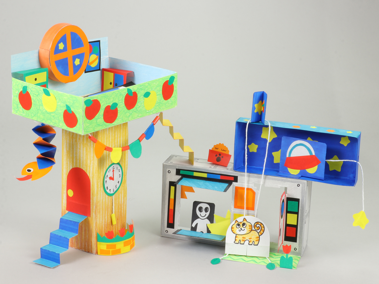 箱を組み合わせて高さのある作品に仕上げました。「ともだちハウスシート」を使って、色とりどりな装飾をつくりました。
