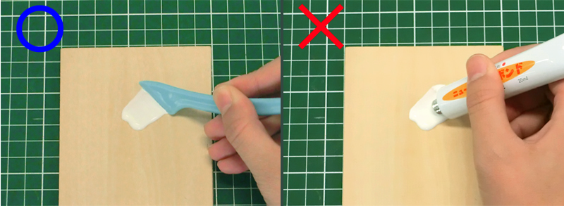 木工用接着剤や化学接着剤をのばすときは、必ずヘラなどを使用します。容器の先でのばすと先が固まって中身が出なくなることがあるので、気をつけましょう。