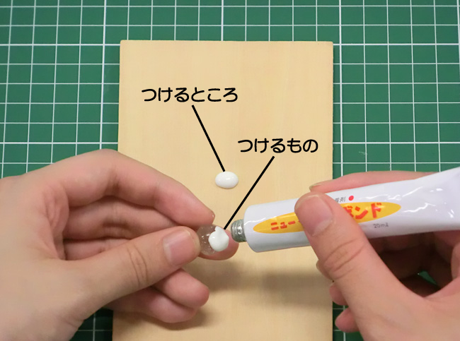 小さいものを貼るときは、つけるものとつけるところの両方に、材料に適した接着剤をつけます。