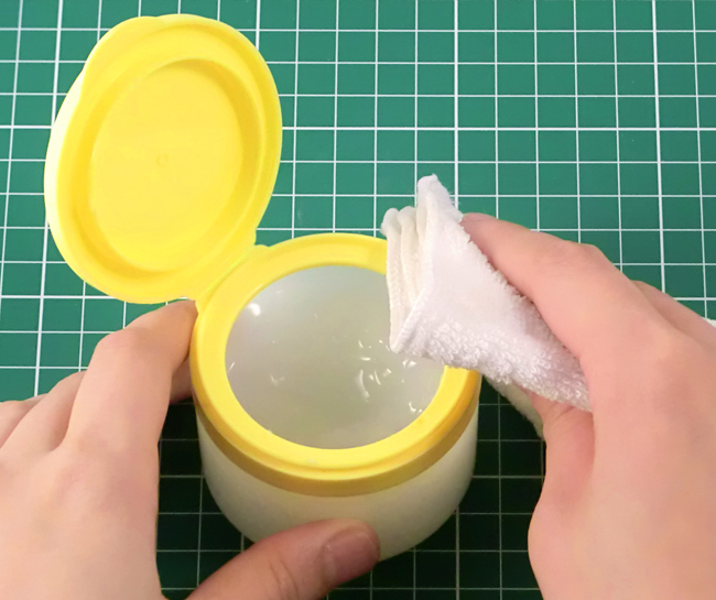容器からはみ出た接着剤は、乾く前にぬれた布で拭き取ります。