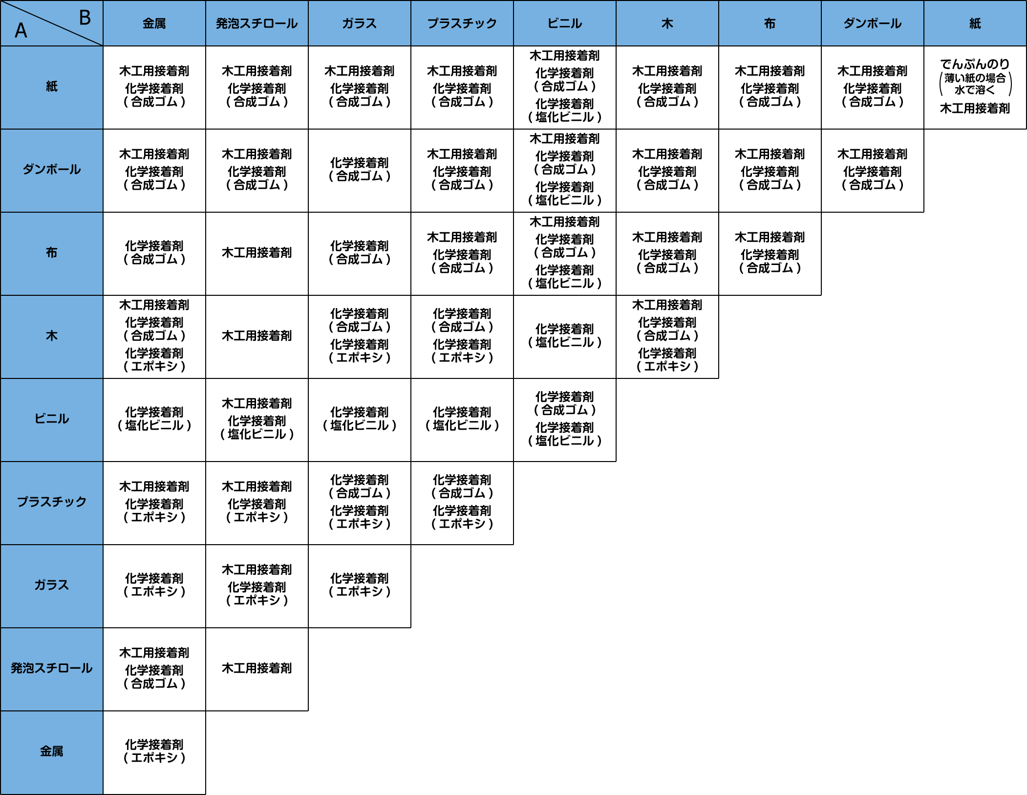 貼り合わせる材料の組み合わせによって、使用に適した接着剤は違います。貼り合わせる材料を下の接着剤適合表のAとBの列からそれぞれ選び、その交差欄にある接着剤を使いましょう。