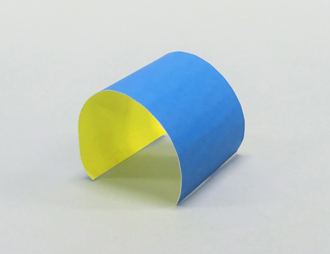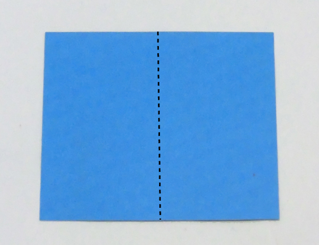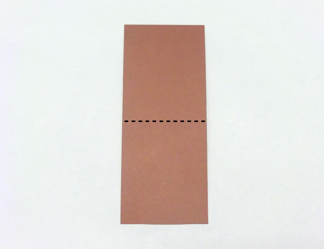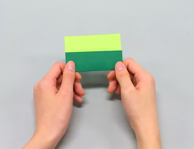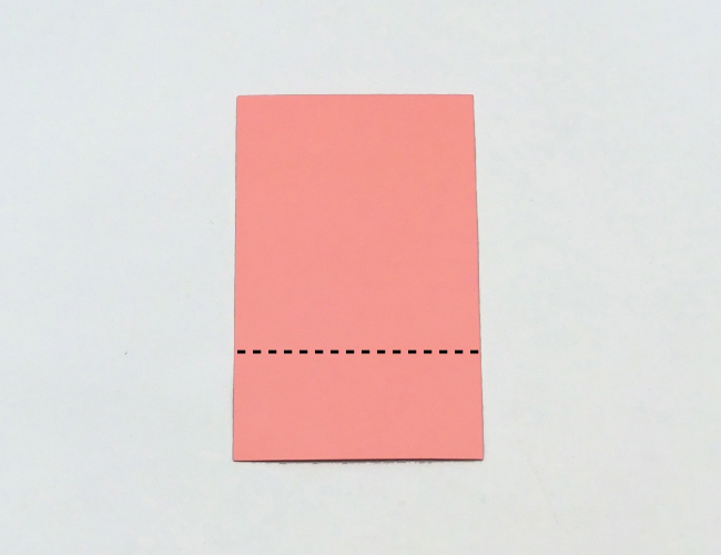 ①長方形に切った両面カラー工作紙を半分に折り、折り目をつけます。