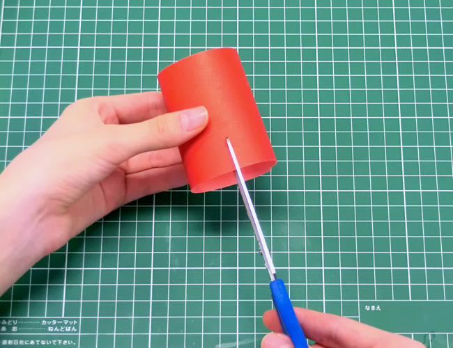 ①長方形に切った両面カラー工作紙を丸めてのりをつけて貼ります。