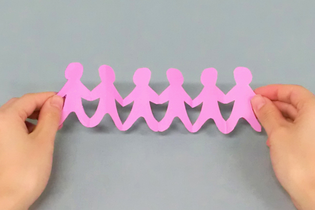 ②紙がずれないよう、4枚重ねてセロハンテープでとめ、線にそって切ります。