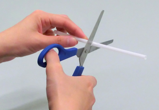 ストローなどの細いものは、はさみの刃の奥を使ってつぶすようにして切りましょう。