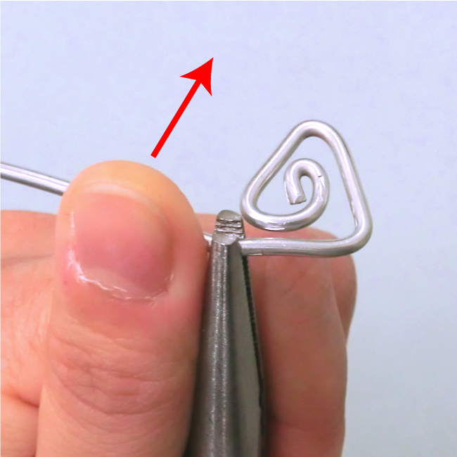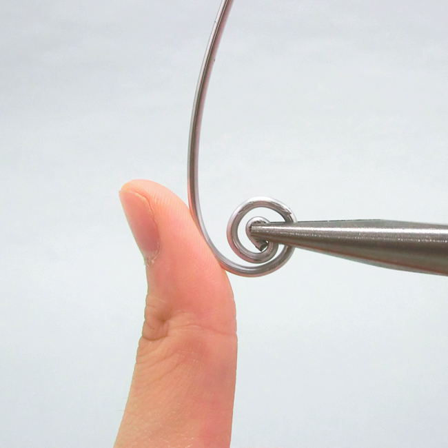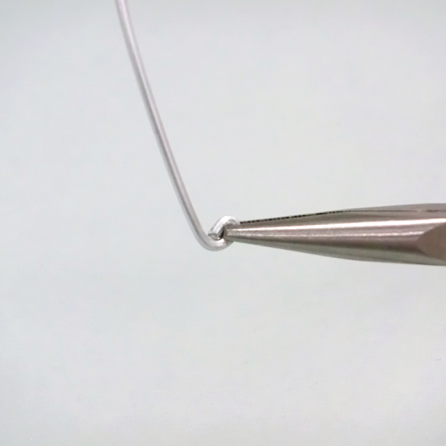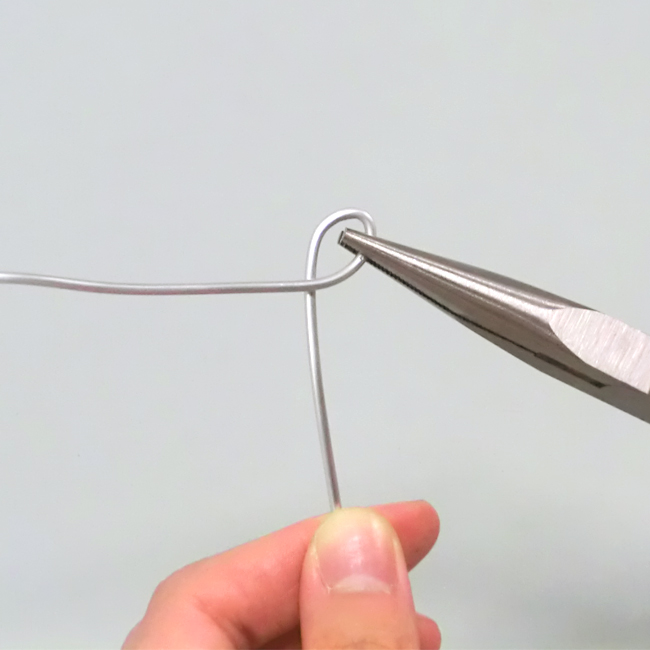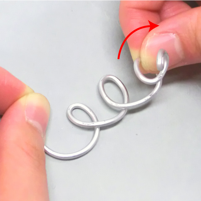 ②中心をラジオペンチではさみ、親指のはらで押し曲げて丸めていきます。