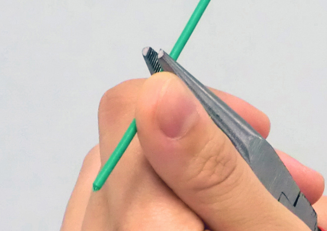 ②ラジオペンチで針金をはさみ、親指をペンチの先に押しつけるように角度をつけて曲げます。