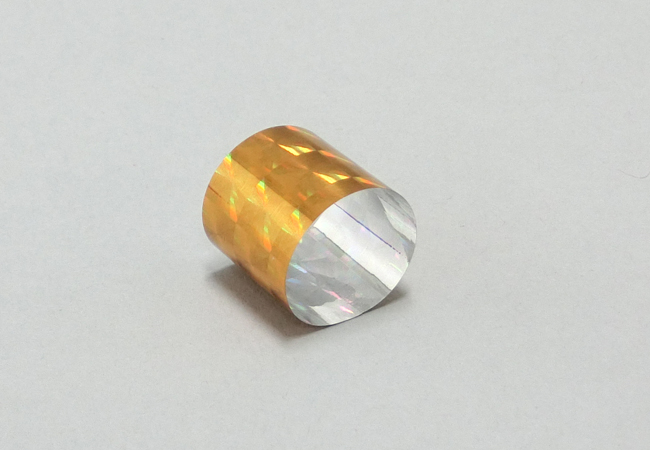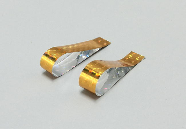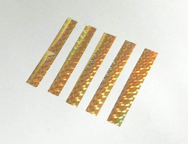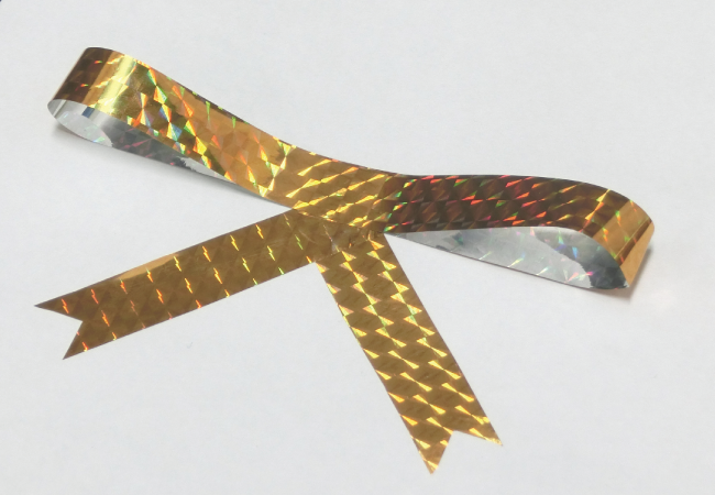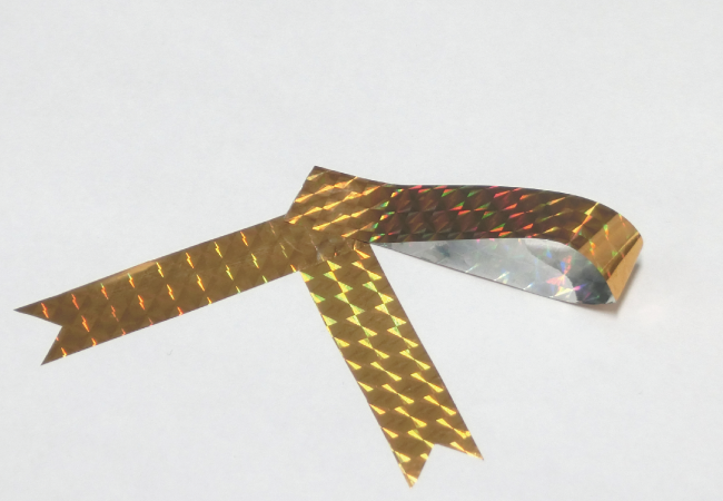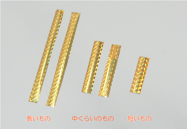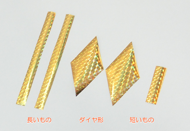 ①ホログラムシートを細長く切ります。長いものを2本、中くらいのものを2本、短いものを1本切りましょう。