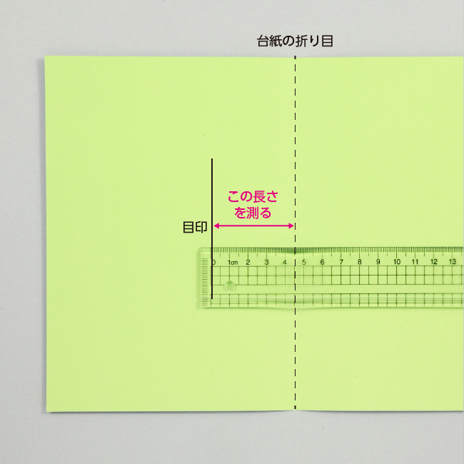 ③ ②で付けた目印と、台紙の折り目の間の長さを定規で測ります。