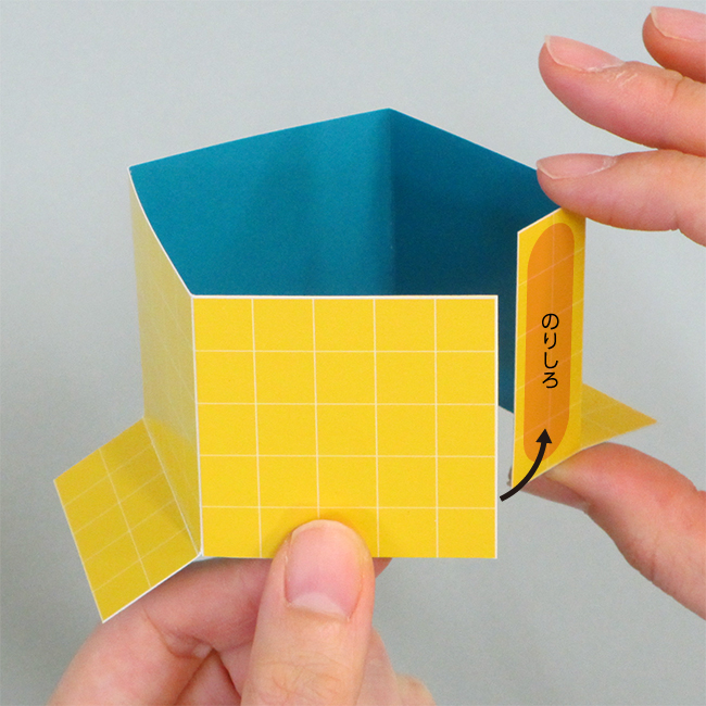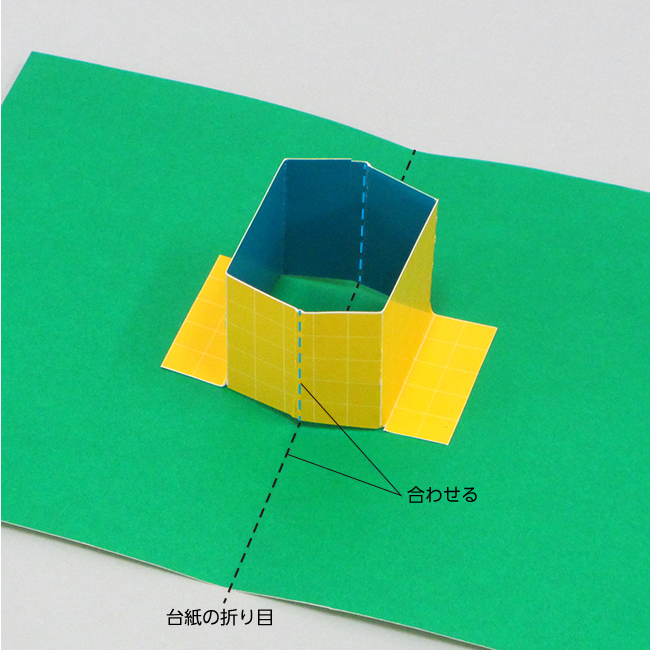 ④ のりしろに接着剤を付け台紙の上に貼り付けます。このとき、②で付けた折り目と台紙の折り目を合わせましょう。