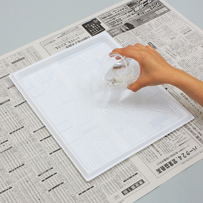 おはながみより大きいサイズのバットなどに洗濯のりと水を混ぜたものを入れておきます。