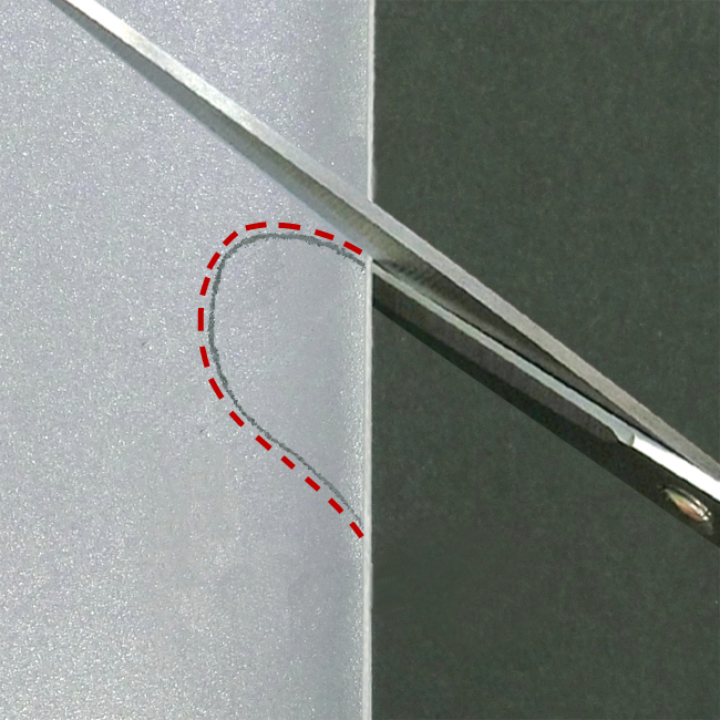 ②線の外側にそって切ります。切るときは、はさみの刃の奥を使います。