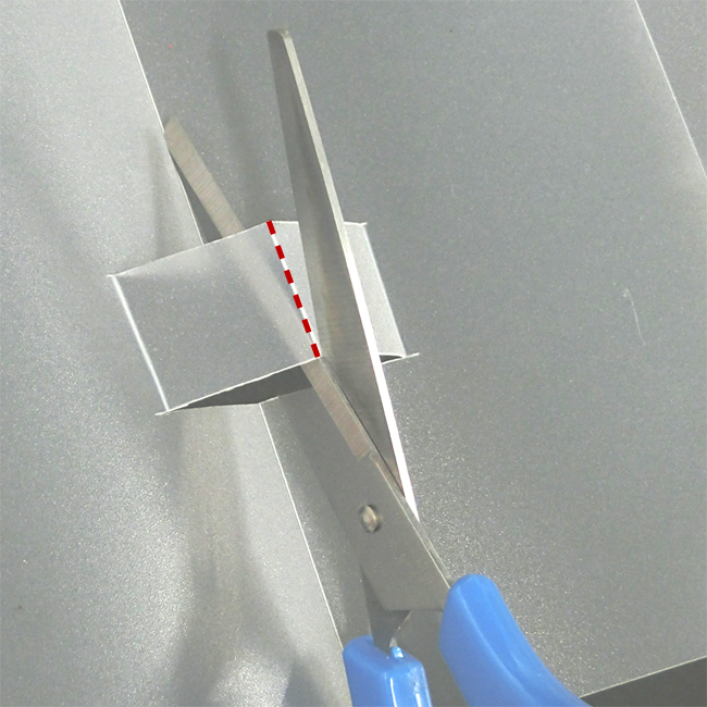 ②透明シェード板を裏返して、真ん中の折り目を切ります。切るときは、はさみの刃の奥を使います。