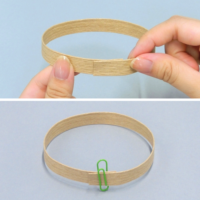 ①紙バンドを輪にして、接着剤でとめます。接着剤が乾くまで、クリップで固定しておきましょう。