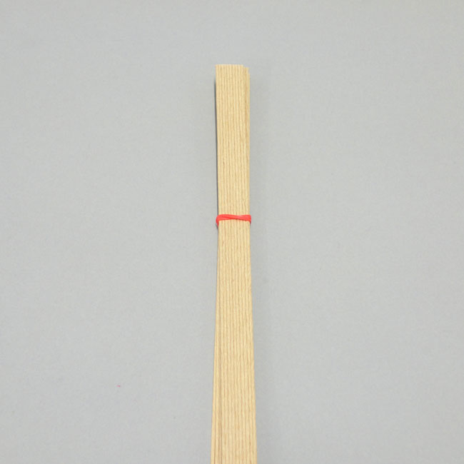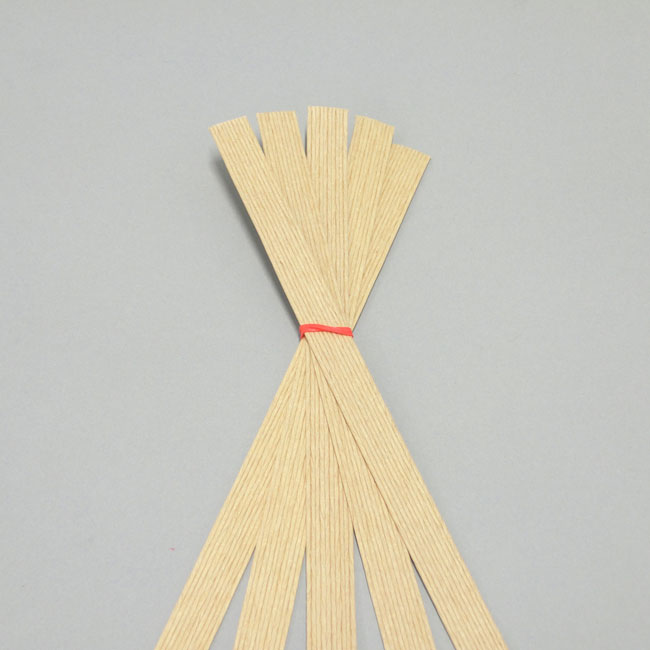 ①固定したい紙バンドの端をひとまとめにし、輪ゴムでたばねます。