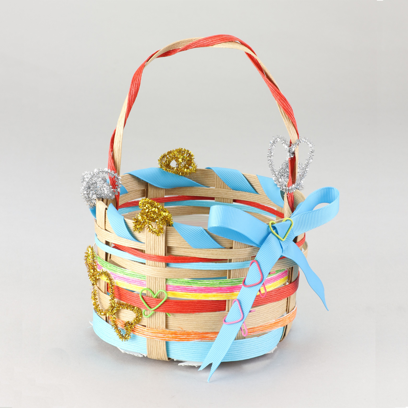 色をつけた紙バンドとカラーバンドで筒かごをつくると、カラフルな作品に仕上がります。