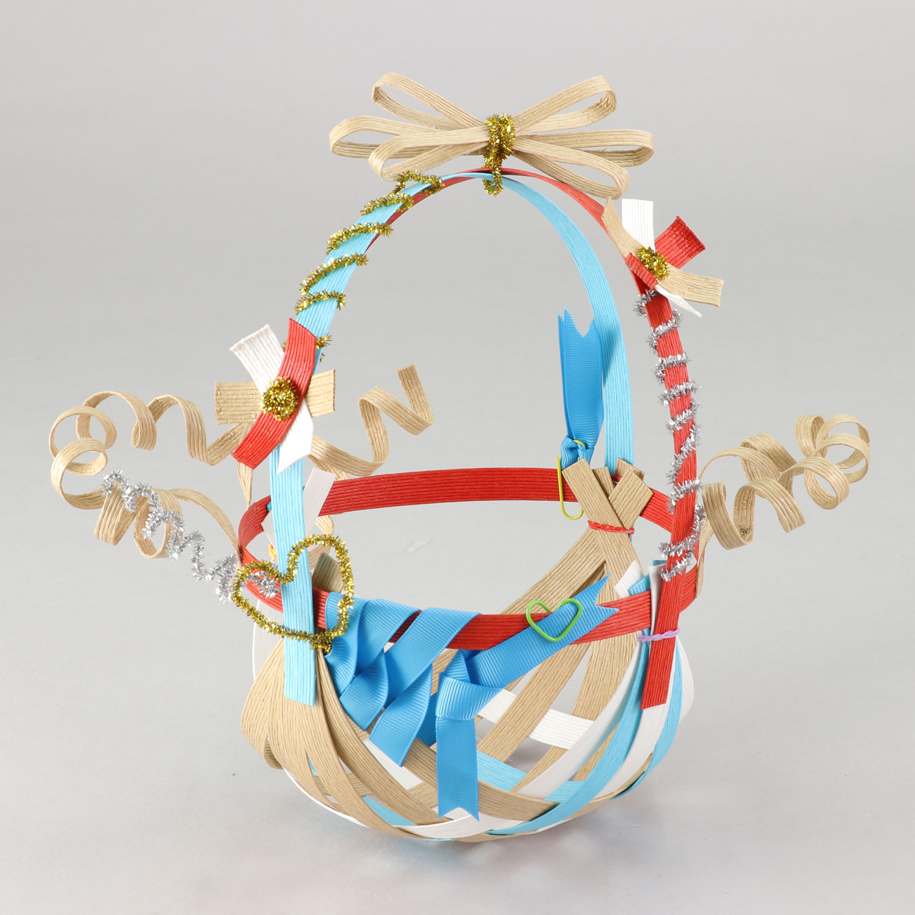 紙バンドで角かごをつくり、取っ手やリボン飾りをつけると、かわいい作品に仕上がります。