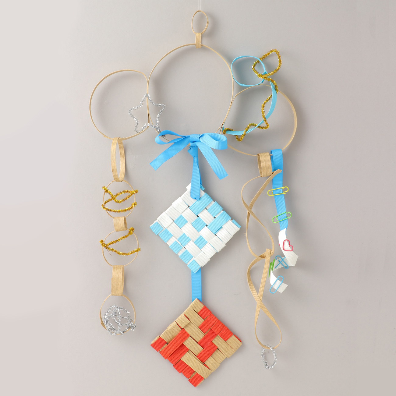 平織りや飾りを組み合わせると、ゆらゆら揺れる吊り下げ型の作品ができます。