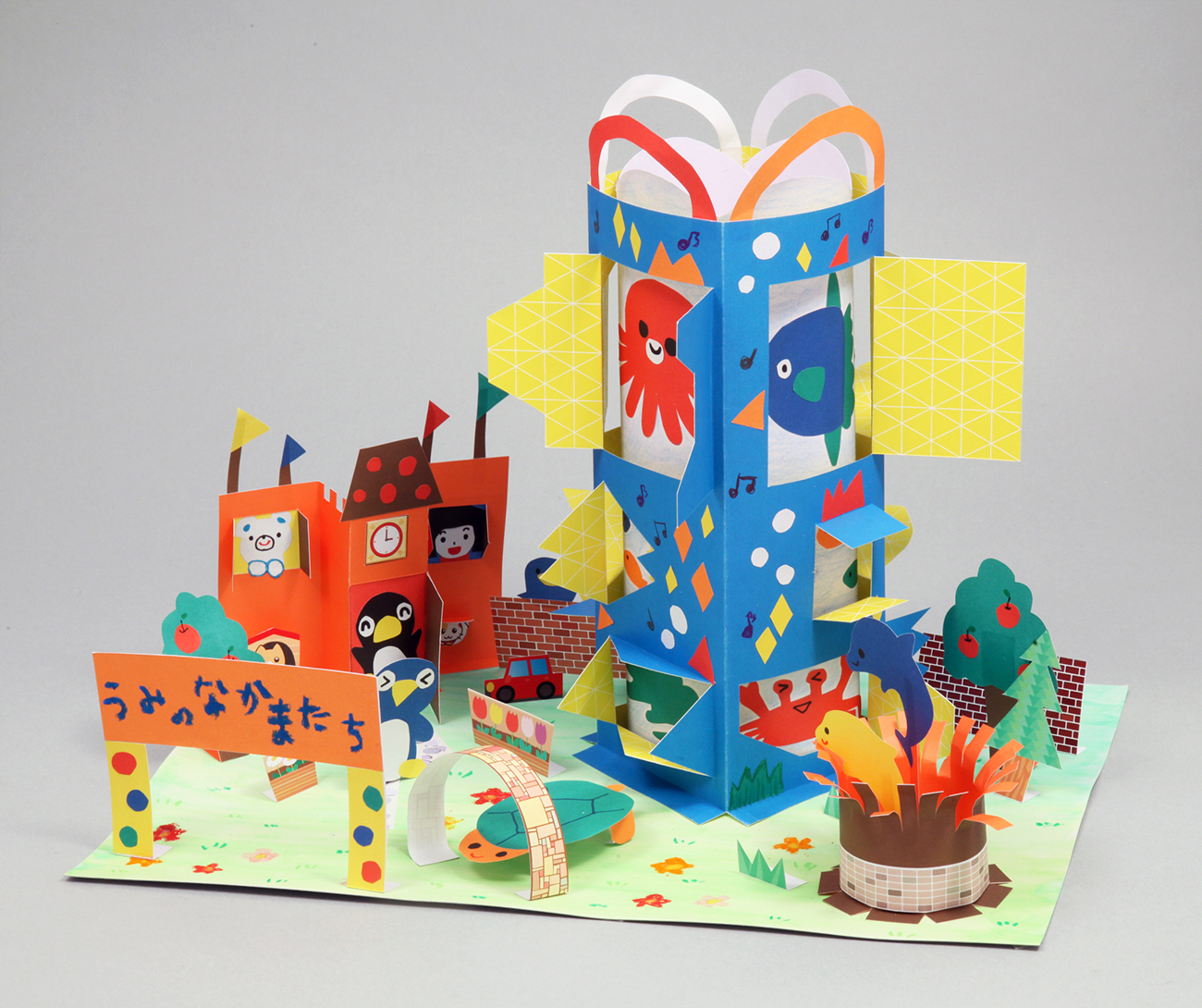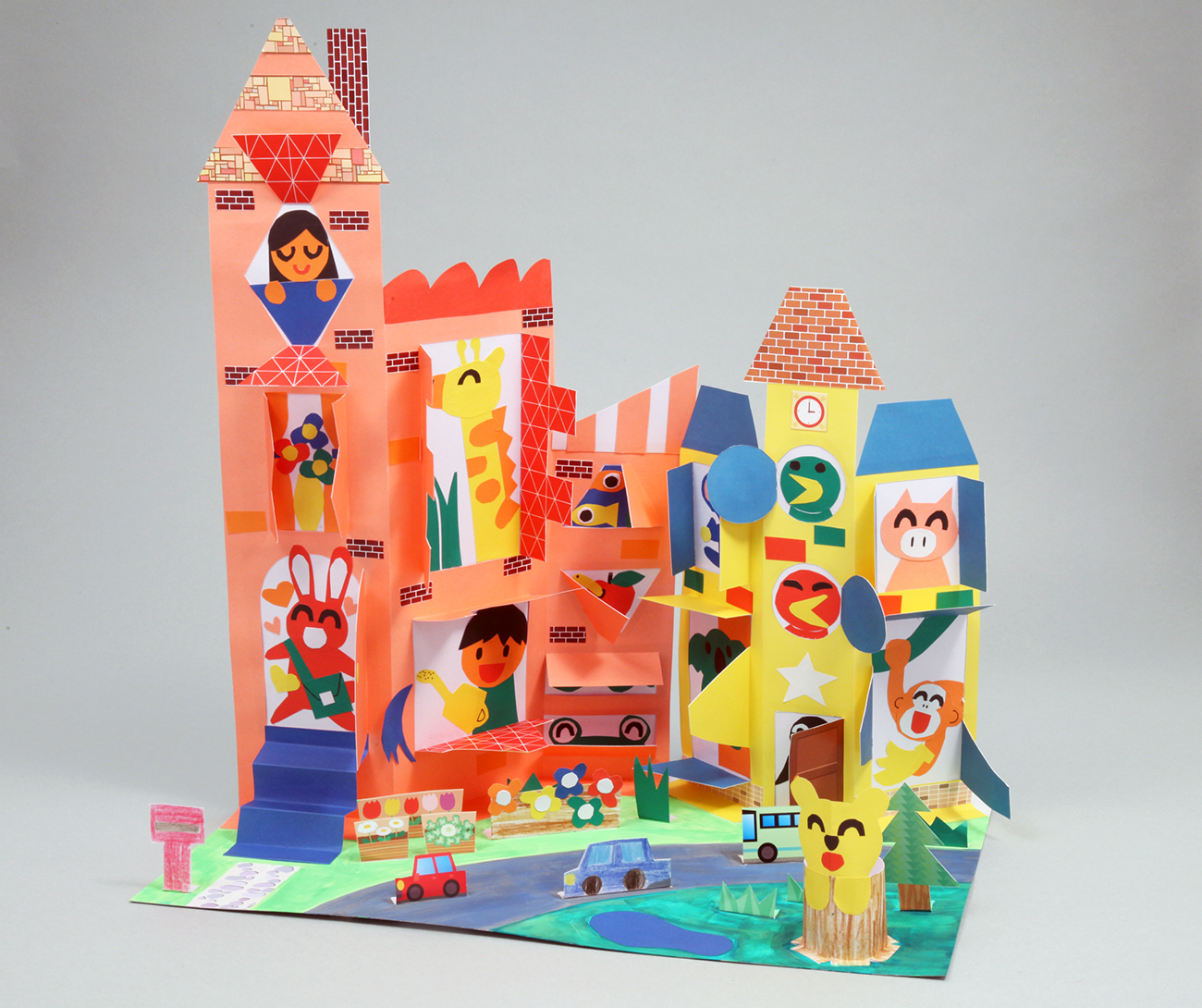 斜方眼紙を折って立てることで、大きくてたくさん窓のあるにぎやかな作品を作ることができます。