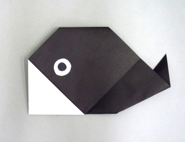①点線で半分に谷折りにして、折り目をつけてもどします。