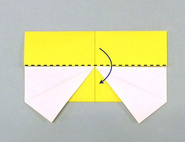 ②ヨコの折り目に合わせて、点線で谷折りにします。
