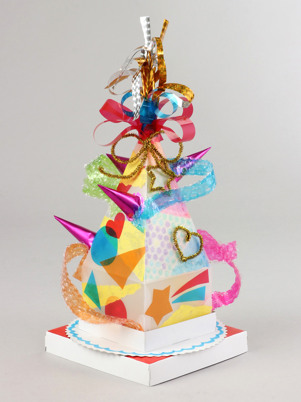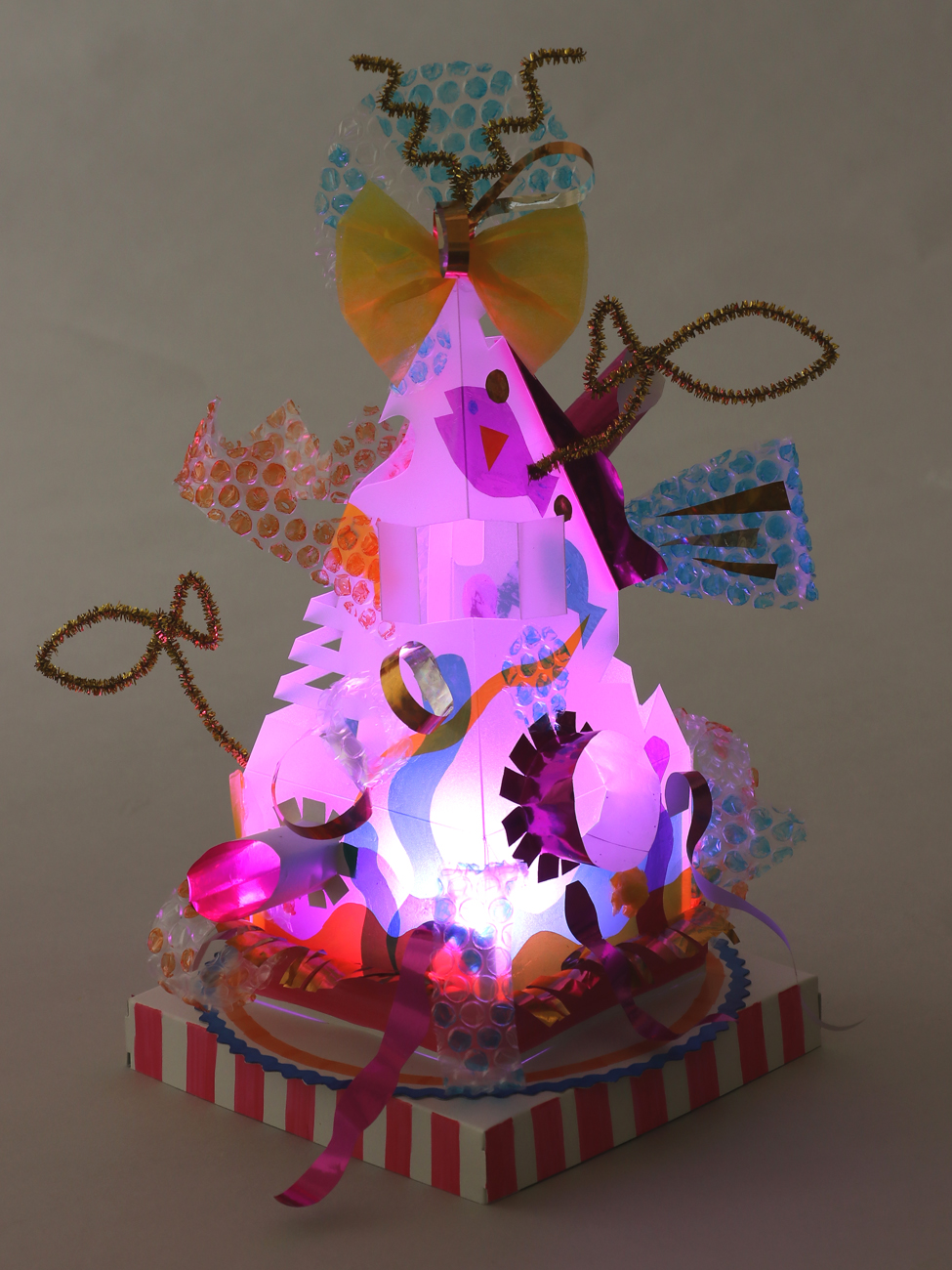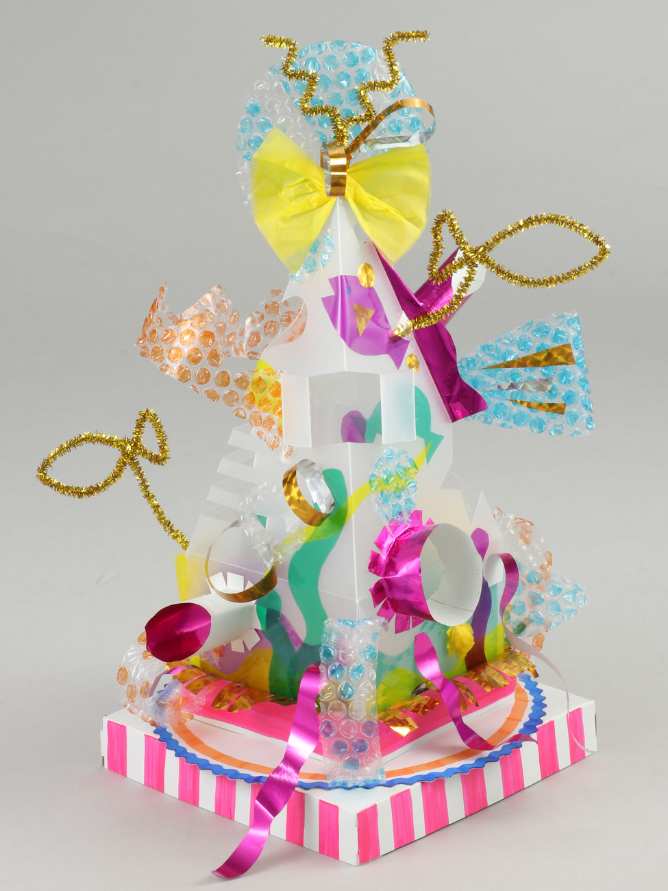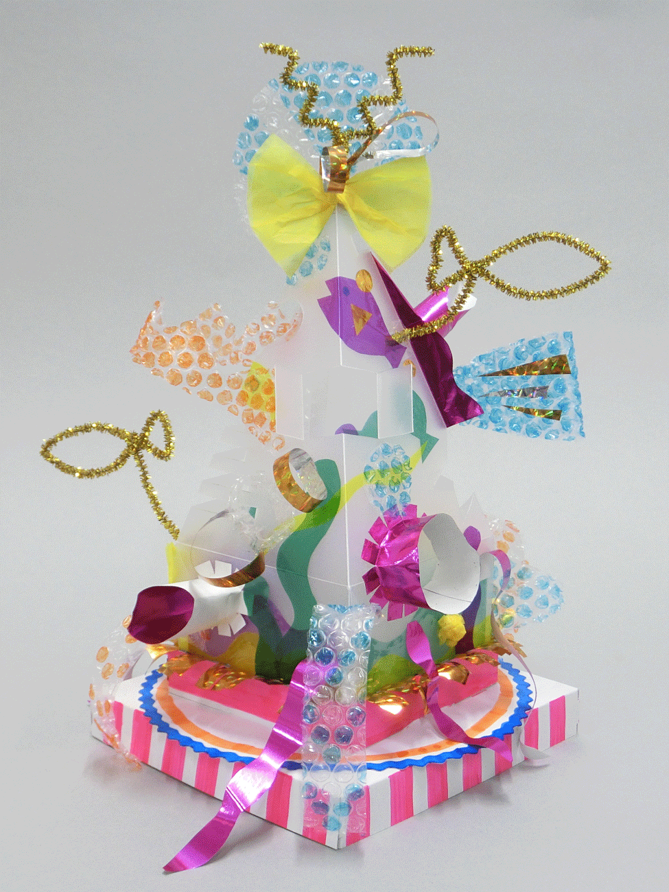 プチプチマットやホイル色紙で大きな飾りをつくり、立体的な作品に仕上げました。