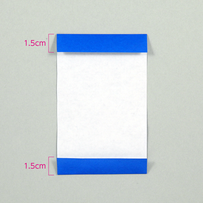 ① 四角に切った紙を用意し、上下とも1.5cmの位置で折り返し、のりしろを作ります。