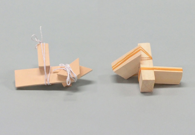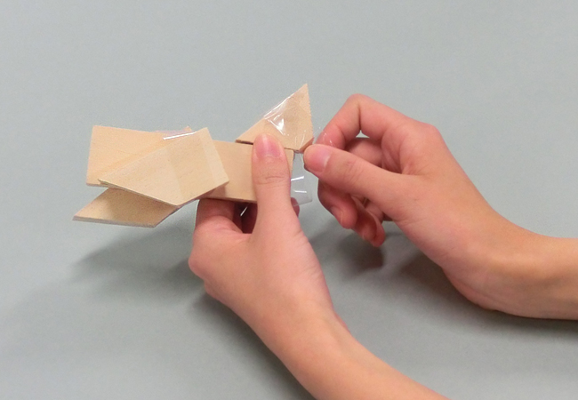 セロハンテープなどを使って仮止めすると、木の組み合わせを何度もやり直すことができます。