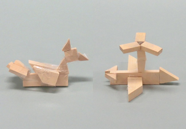 ②木の積み方や貼りつけるときの向きをいろいろと試し、切った木からできあがる形を探しましょう。