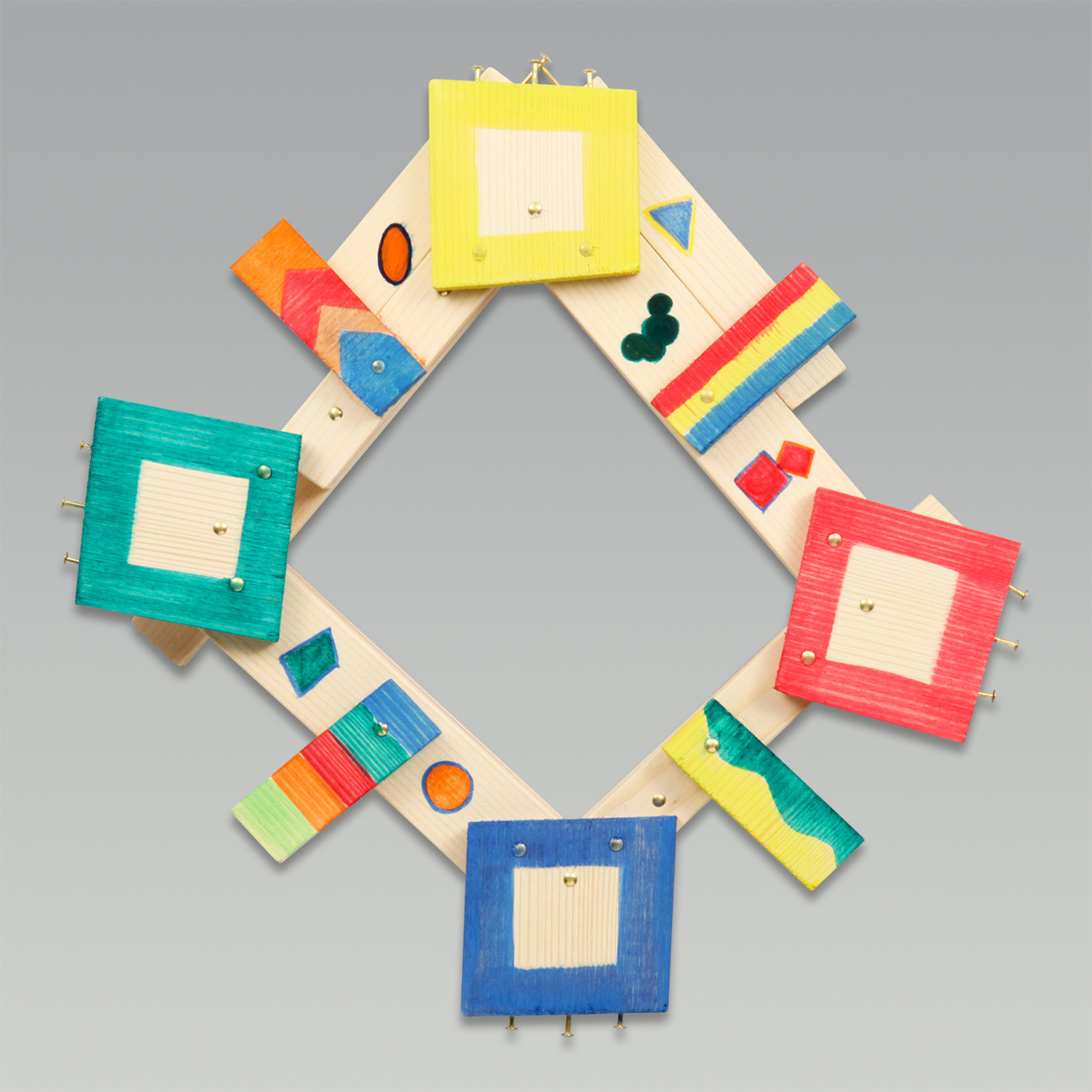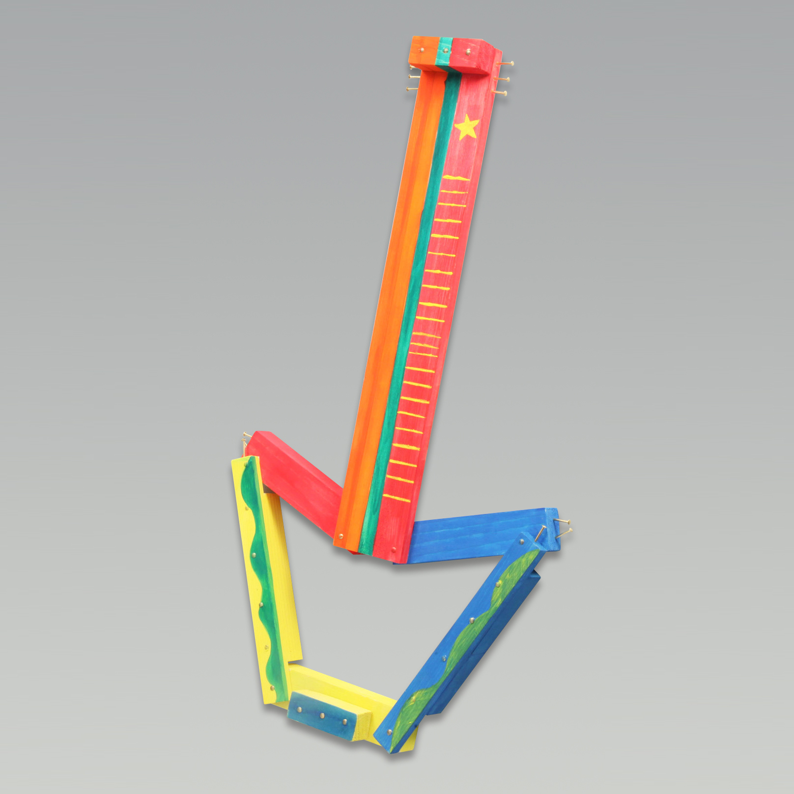 作品例 『四角いがくぶち』高さ26cm/セット内容のみ使用角に釘を3本ずつ使って板を打ちつけることで丈夫ながくぶちを作りました。 『ロックギター』高さ40cm/セット内容のみ使用長い板を切らずに使うことでギターのネックに見えるようにしました。釘で弦まきを表現しています。