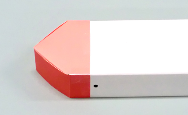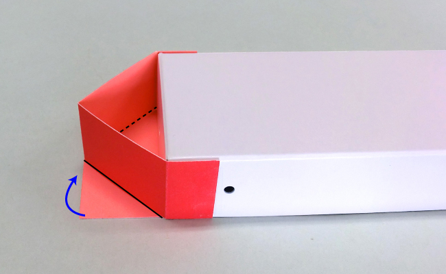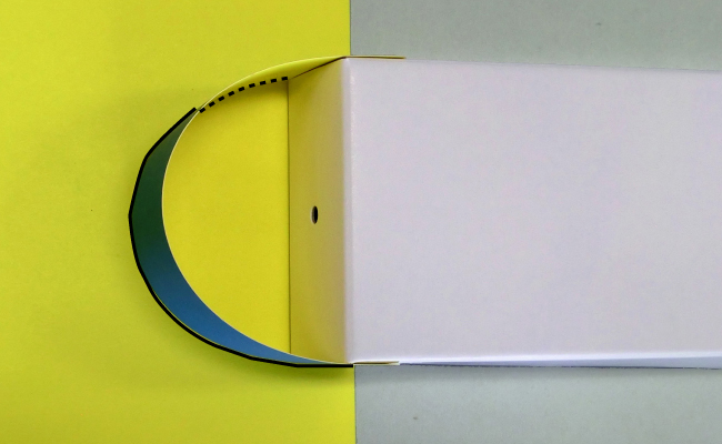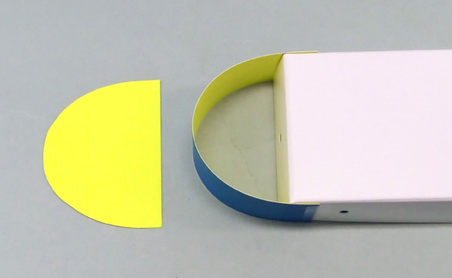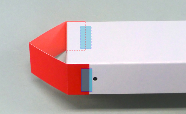 ②箱の側面にセロハンテープで貼りつけます。矢印の部分に余裕を持たせ、丸くしましょう。