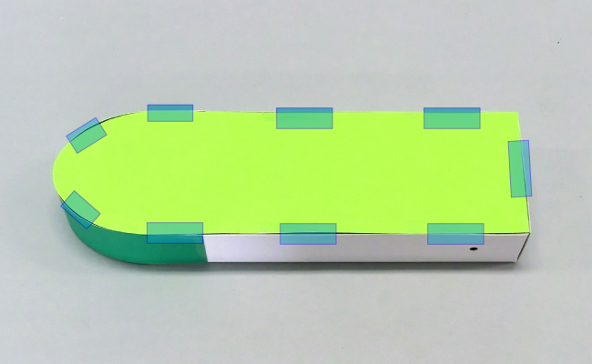 ②箱の側面にセロハンテープで貼りつけます。紙に余裕を持たせ、丸みをつくりましょう。