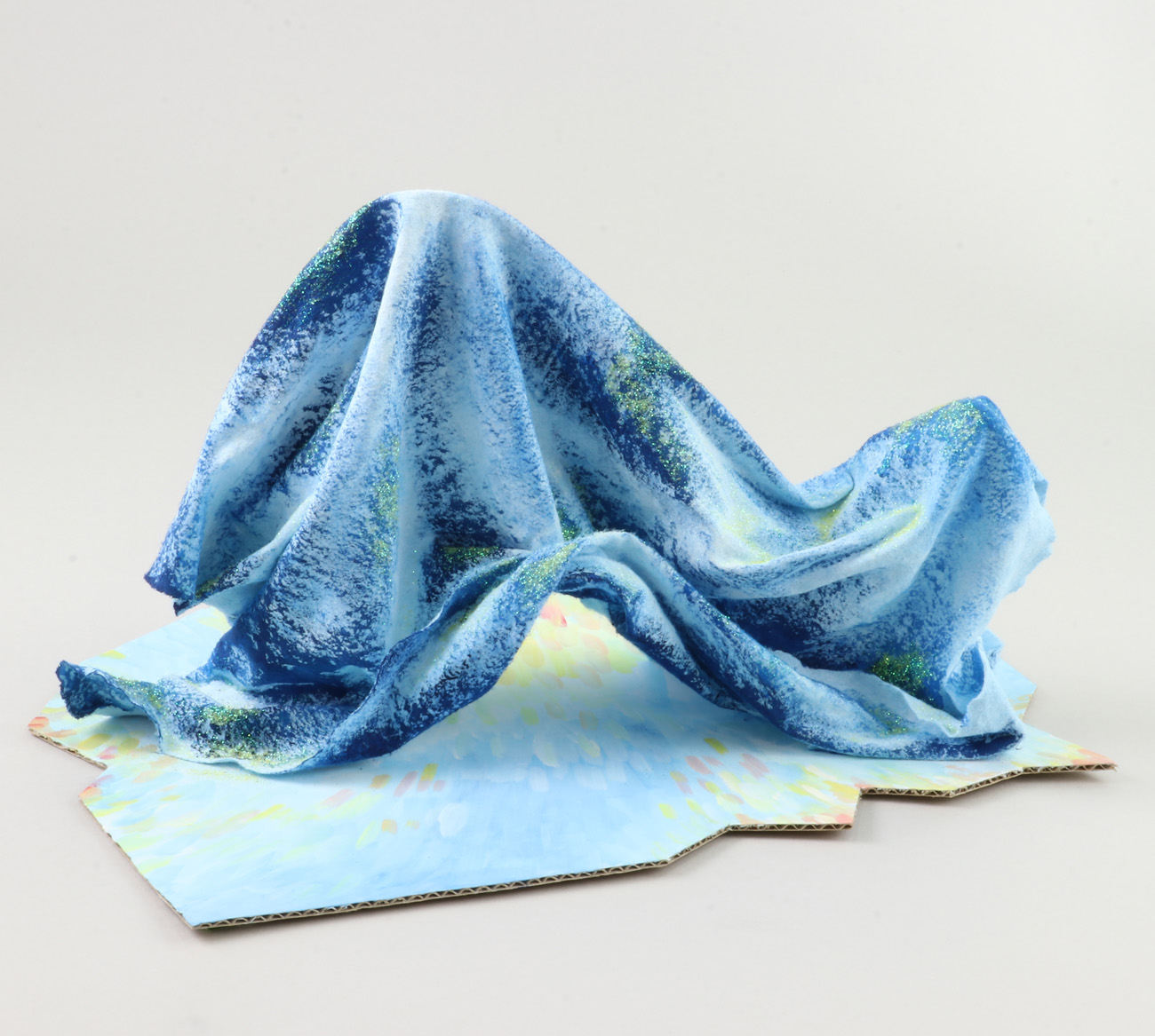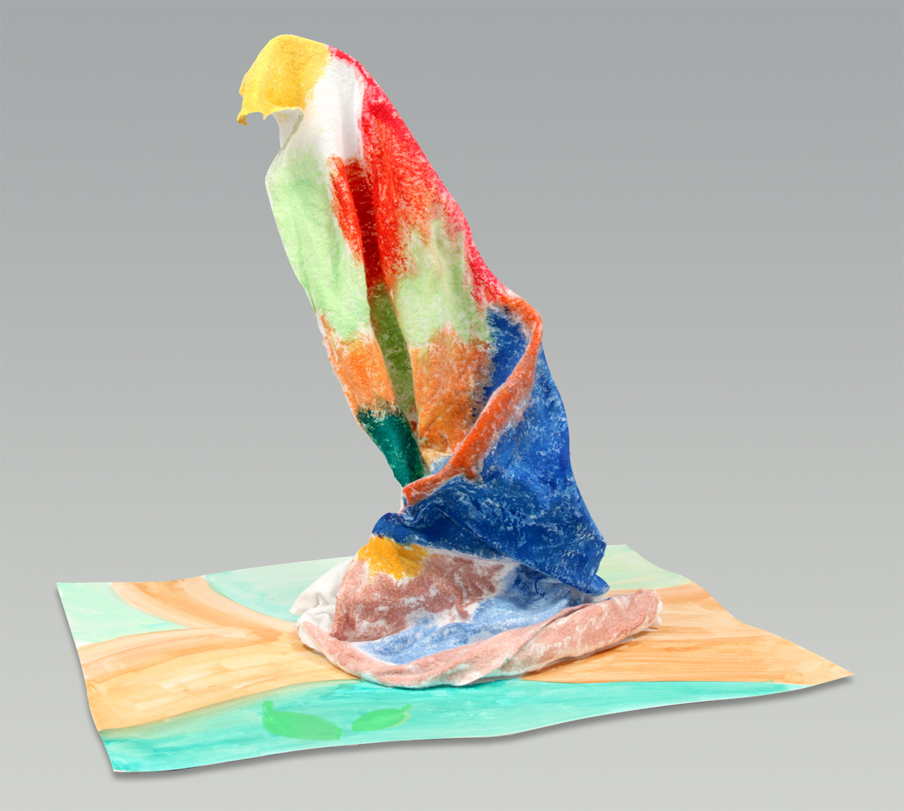作品例 『ジャングルのオウム』高さ34cm/セット内容のみ使用針金を縦に使うことで高さのある作品に仕上げました。不織布をねじることで鳥の羽を表現しました。 『海の呼吸』高さ18cm/セット内容のみ使用針金を曲げて凹凸を作り、横向きに立てました。不織布のしわを利用し波の動きを表現しました。