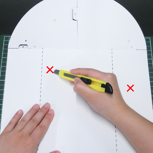 ×印を2カ所とも土台の天井部分につくってしまうと、透明カプセルをつり下げたときに土台のバランスが崩れることがあります。