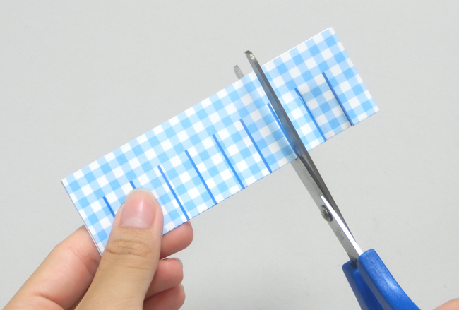 名前欄の入った、はさみ練習紙①を使って紙テープをつくりましょう。