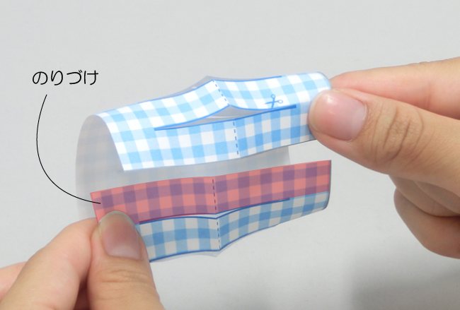⑦㋕の点線にそって山折りし、貼り合わせて完成です。