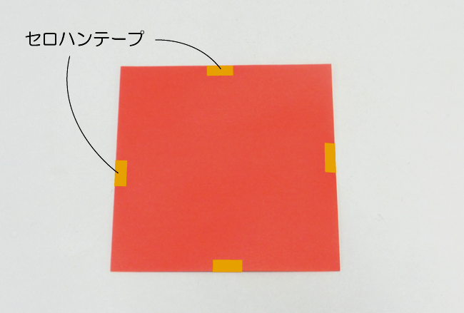 ①2枚の色がみの位置をそろえて、セロハンテープで4カ所とめます。この時、見せたい色を外側に向けておきます。