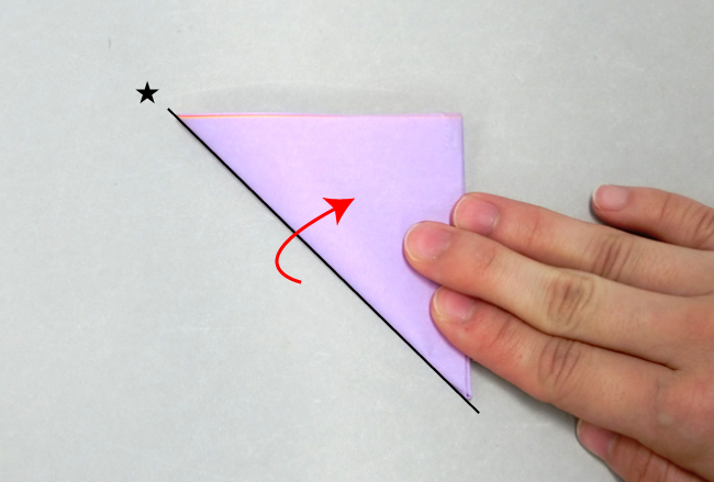 ④左下の角と右上の角をくっつけるようにして折ります。