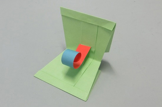 ②頭の台紙のとび出し部分にのりで貼ると、丸まった舌の完成です。
